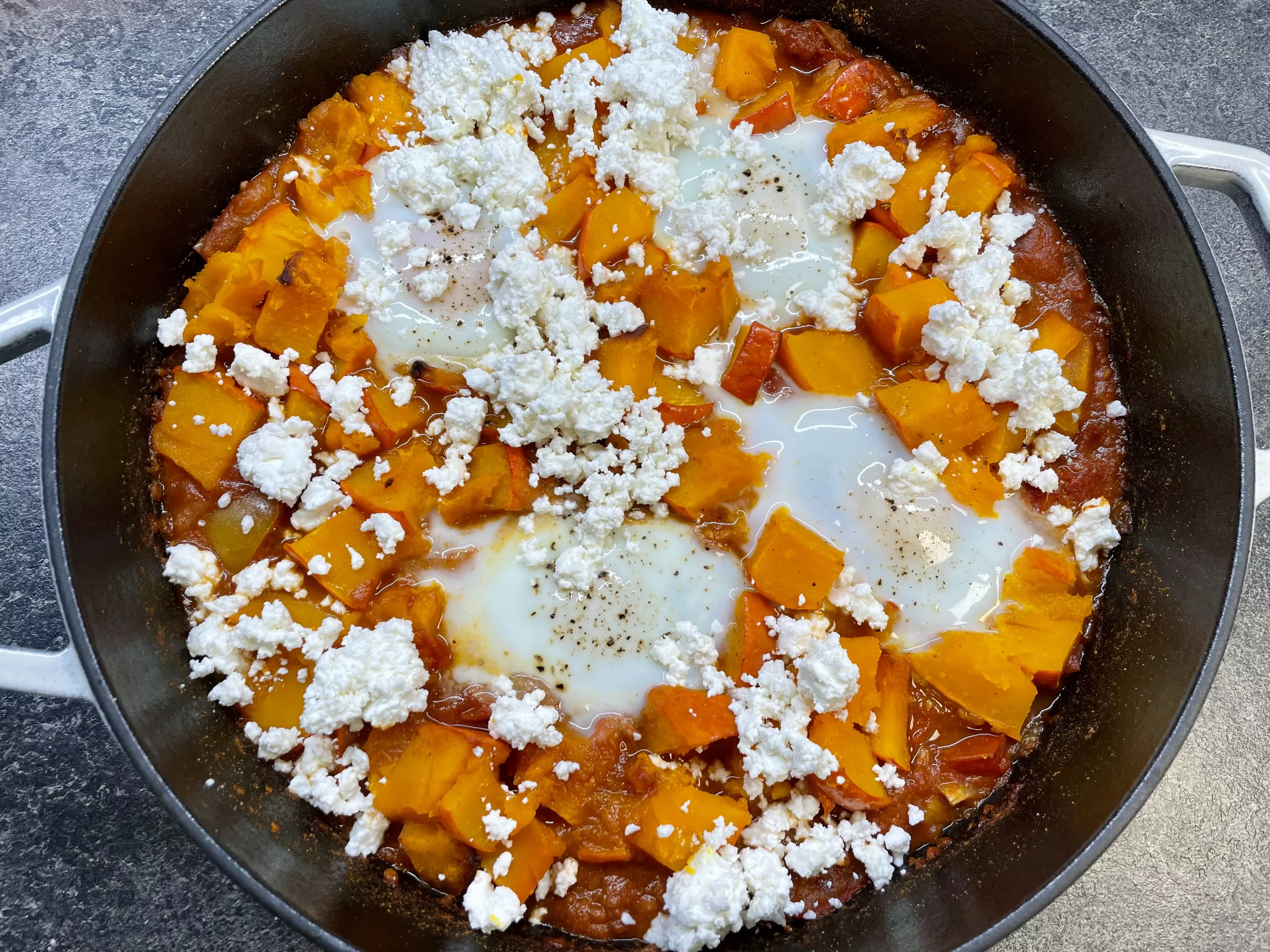 Die Zwiebel schälen und würfeln. In einer ofenfesten Pfanne in etwas Öl anbraten. Die Gewürze und das Tomatenmark hinzugeben. Kurz anrösten, dann mit den Tomaten ablöschen und 10 Minuten köcheln lassen. Den Kürbis hinzugeben.