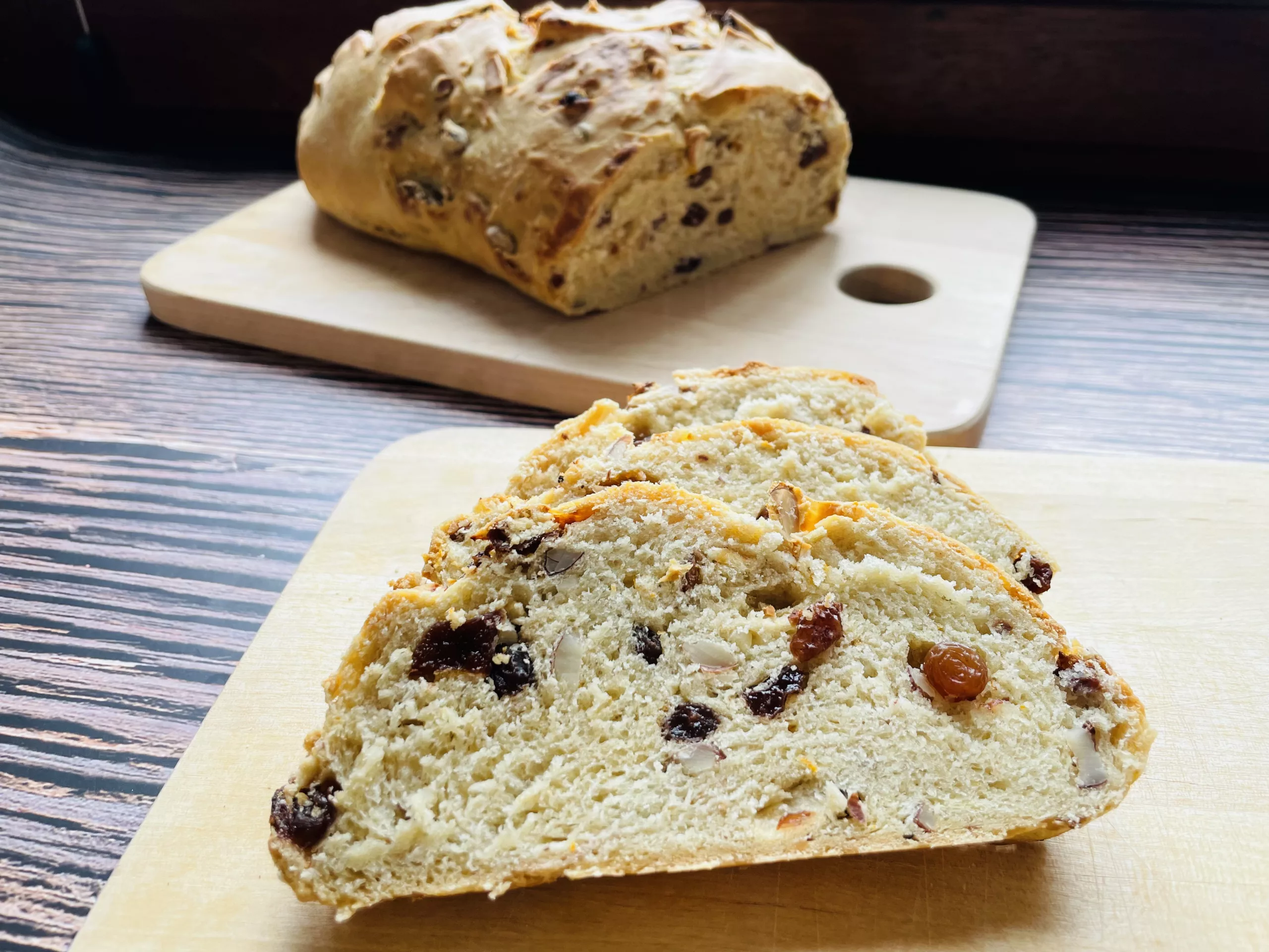 Jetzt Rosinen, Aprikosen und gehackte geröstete Mandeln hinzugeben und verkneten. Wer mag kann typische Würfelzuckerstücke / Kandiszucker hinzufügen.