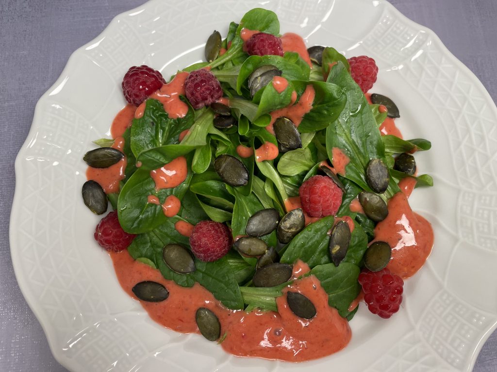 Feldsalat waschen und auf Teller bzw. Schüsseln verteilen. Das Dressing darübergeben und mit Kürbiskernen und Himbeeren dekorieren.