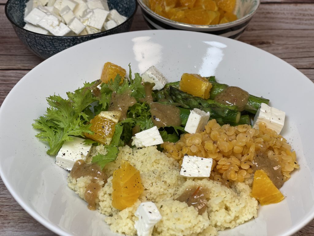 Heute gibt es Brokkoli aus dem Ofen mit einer Tahincreme und Tofu überbacken. Tahin ist eine Paste aus Sesam und stammt aus der arabischen Küche. Es hat eine gewisse herbe Note. Diese wird aber durch den Honig und die Orange abgemildert. Als Beilage gibt es dazu Couscous, es passt aber auch Bulgur oder Polenta.